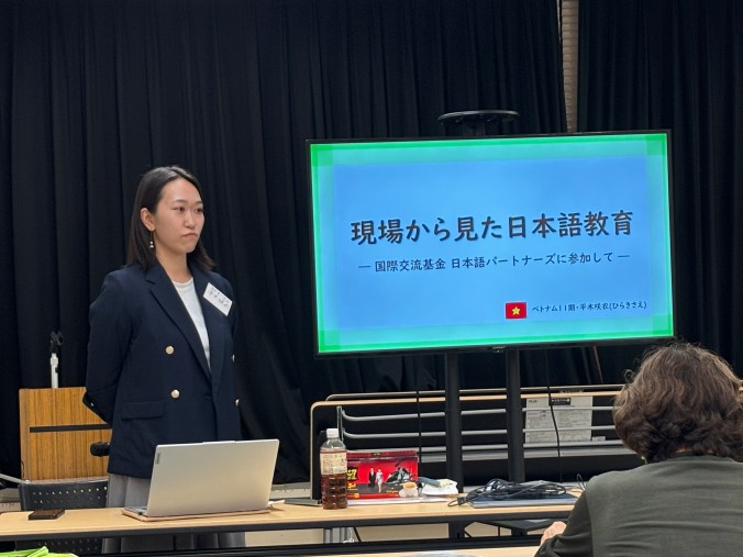10分間の休憩の後、9月下旬に早稲田大学大学院日本語教育研究科に進学する平木咲衣さんが「現地から見た日本語教育~国際交流基金パートナーズに参加して」をテーマに、ベトナムでの参加体験を報告しました。現地の小学校、中学校、高校の日本語の授業の様子が写真や動画を使ってリアルに再現されたほか、ベトナム人生徒が日本語で書いた作文も紹介されるなど大変興味深い報告でした。平木さんは北海道出身で、大学時代に日本語教員養成コースを受講、函館の水産加工業に従事するベトナム人技能実習生と交流したり、北海道東川町の日本初の公立日本語学校の調査研究を行ったり、地域の多文化共生に関わってきました。報告ではこうした経験も明らかにされ、大学院進学後の日本語教育に関する研究計画についても語ってくれました。平木さんの報告を受けて文部科学省日本語教育課の増田麻美子・日本語教育調査官が「日本語教育は大きな転換点を迎えている」と日本語教師が国家資格になった後の状況の変化を説明し、文科省が様々な対応策を取っていることが示されました。