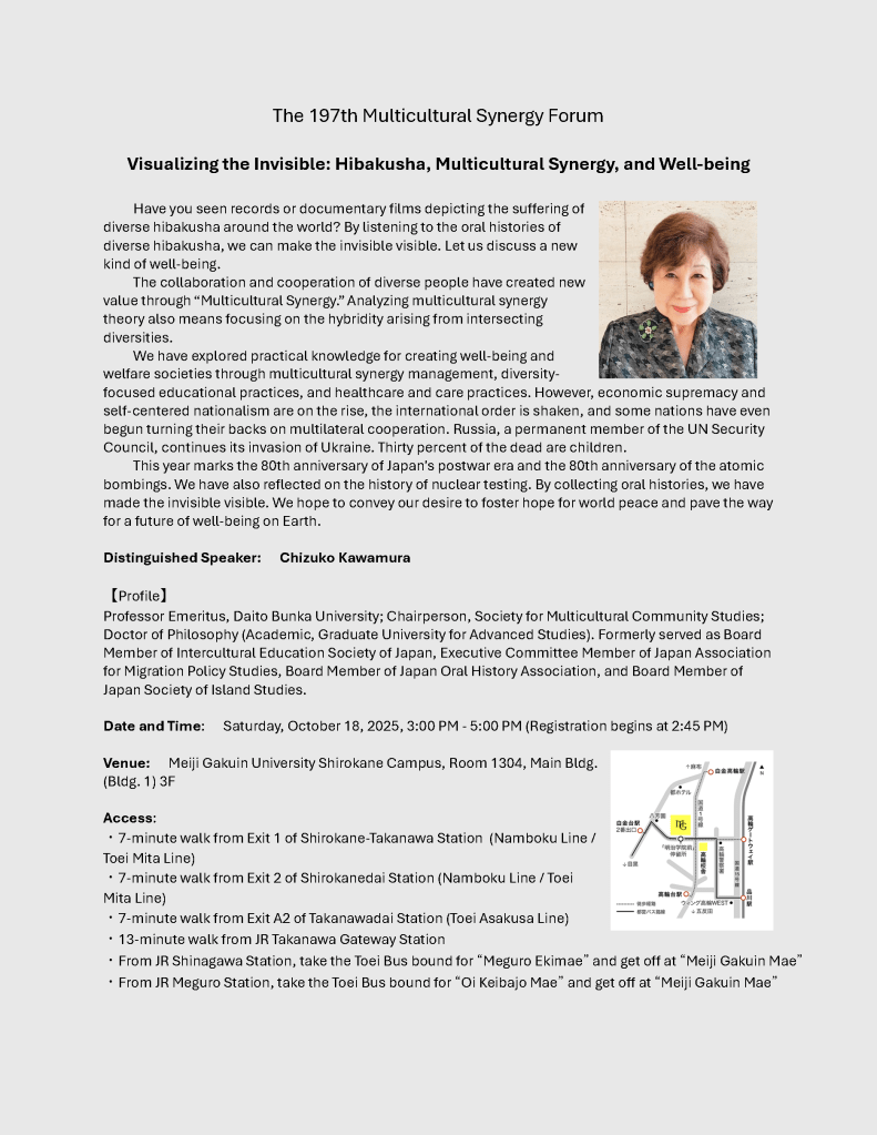 2025年10月18日、第197回多文化共創フォーラムを明治学院大学で開催しました。フォーラムでは、川村千鶴子 多文化社会研究会理事長が「視えないものを可視化する-ヒバクシャと多文化共創、そしてウェルビーイング」と題する基調講演を行いました。