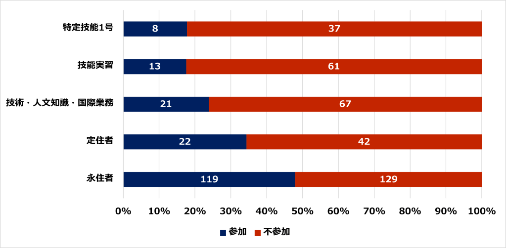 まず、お祭りやスポーツ大会など地域行事への参加率を見てみましょう。図1.より、法的地位の安定性ひいては定住傾向と比例するように、外国人労働者よりもいわゆる身分系の在留資格を持つ外国人の方が、地域行事への参加率が高いことが分かります。