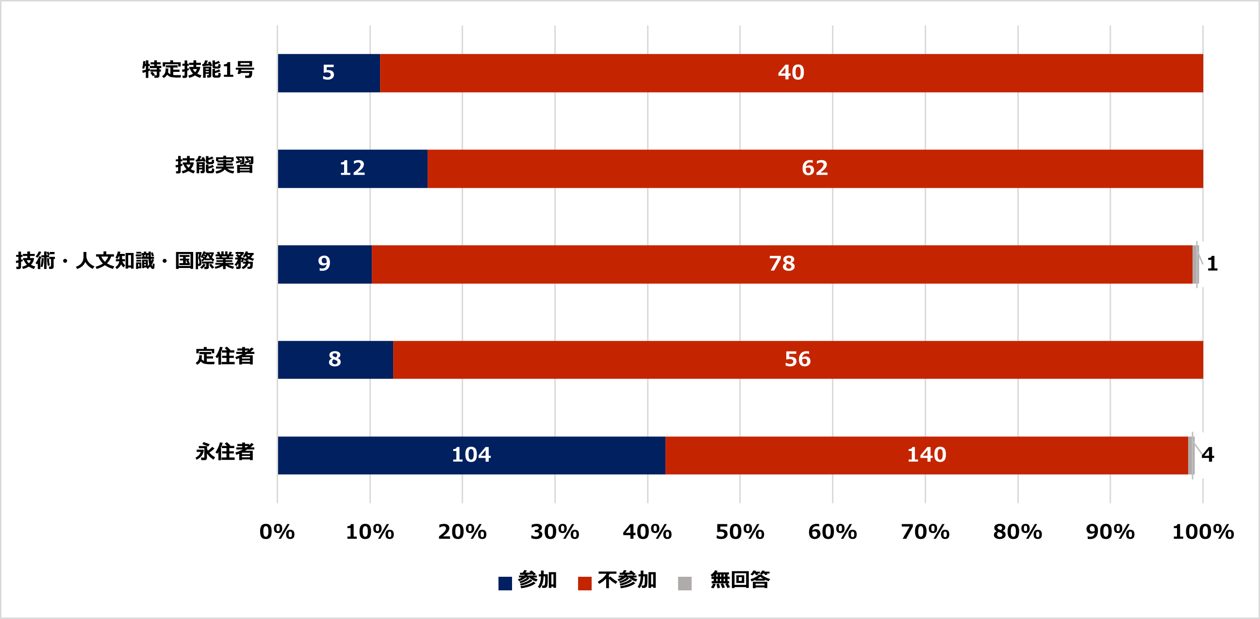 次に、地域で開催される防災訓練への参加率を見てみましょう。まず、図1.と図2.を比べると、娯楽として気軽に参加できる地域行事よりも防災訓練の場合は、全体的に外国人の参加率が低くなります。また、在留資格別に見ると、防災訓練については、他の在留資格を持つ外国人に比べ、在留期間の定めのない「永住者」の参加率が圧倒的に高いことが分かります。