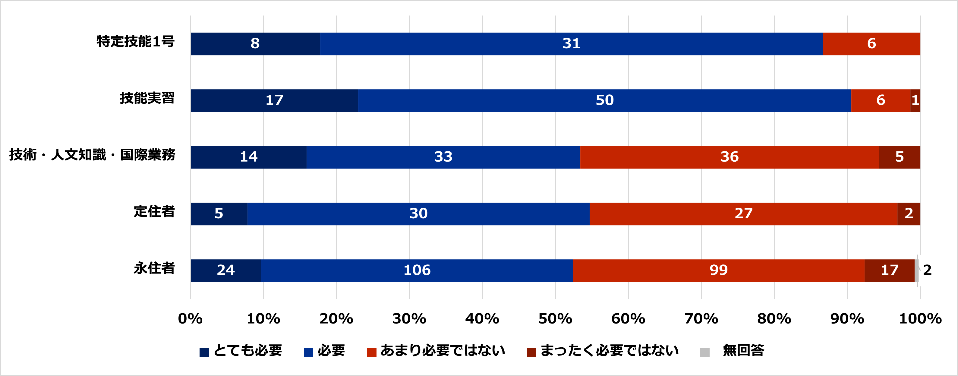 今度は、地域活動に参加する必要性をどのくらい感じているのか、外国人の意識に着目します。図3.より、「永住者」や「定住者」といった身分系の在留資格を持つ外国人に比べ、「技能実習」や「特定技能1号」といった在留資格を持つ外国人は、地域活動に参加する必要性を強く感じていることが分かります。一方で、身分系の在留資格を持つ外国人と同様に、高度人材と言われる「技術・人文知識・国際業務」の在留資格を持つ外国人の約半数は、地域活動に参加する必要性を感じていないことも明らかになりました。