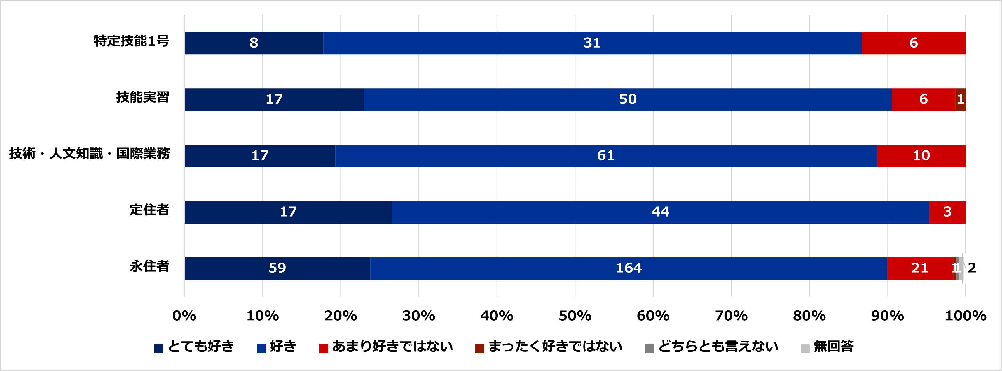 まず、外国人労働者の多くが、「スキルの獲得・将来のキャリア向上のため」、「お金を稼ぐ・仕送り(送金)のため」などの理由で来日し、居住場所が職場の事情によって決定されることが多い中、在留資格の種類にかかわらず、外国人の地域に対する愛着が全体的に高いことは、注目に値します3。受け入れ社会への帰属意識を育みやすくなるためです。