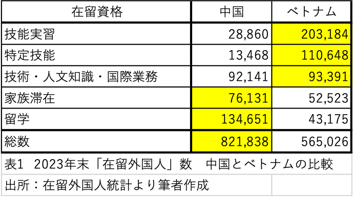 2023年末時点のベトナム人数を、在留資格ごとに見ていくと、1位「技能実習」(203,184人)、2位「特定技能」(110,648人)、3位「技術・人文知識・国際業務」(93,391人)、4位「家族滞在[ⅰ]」(52,523人)、5位「留学」(43,175人)となります。表1が示すように「技能実習」「特定技能」「技術・人文知識・国際業務」では、在留外国人数1位の中国よりもベトナムの方が、その数が多くなっています[ⅱ]。また、「家族滞在」でも「留学」でも資格外活動許可を得れば週28時間のアルバイトが可能です。ベトナム人においては、在留期限付きで就労が可能な在留資格で、日本で暮らしている人が多いです。