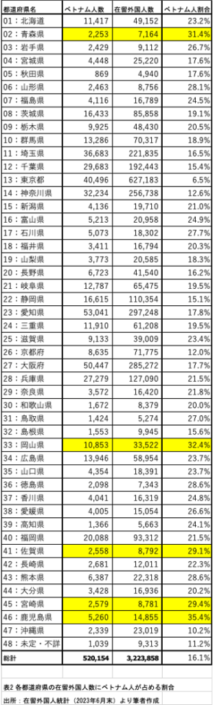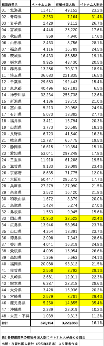 次に、2023年6月末時点の都道府県別の在留外国人数に占めるベトナム人の割合を見てみます(表2)。割合が高い順に、1)鹿児島県(35.4%)、2)岡山県(32.4%)、3)青森県(31.4%)、4)宮崎県(29.4%)、5)佐賀県(29.1%)となります。上位5つの県に共通するのは高齢化・過疎化が進んでいる点です。技能実習生を中心としたベトナム人が若年労働力を地方で補っている様子がうかがわれます。一方、ベトナム人の在留外国人に占める割合が最も低い東京都では6.5%に過ぎません。