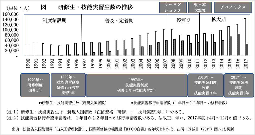 バブル経済期に設計された技能実習制度は、「失われた20年」といわれる不況の時代を通じて、景気変動と制度変更の影響を受けながら、①制度創設期(1990年~1996年)、② 普及・定着期(1997年~2007年)、③停滞期(2008年~2011年)、④拡大期(2012年~現在)を経て、労働力需給調整の手段としての機能を果たしつつ、日本独自の制度として発展し、定着してきました(図参照)。