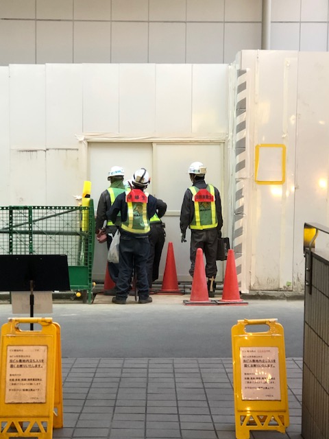 雪が降る中、屋上から降りながら、ビルの外壁清掃に精を出す人がいました。