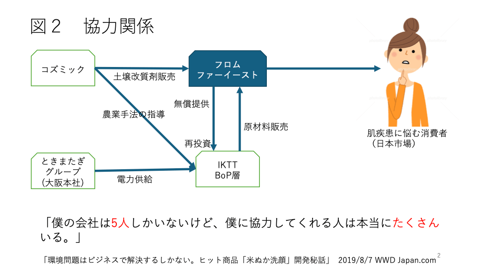 フロムファーイーストは日本人とカンボジア人がそれぞれの技術と叡智を持ち寄り、真摯な協働のもと、「共通価値の創造」を見事に実現し、とりわけカンボジアにおける人々のウェルビーイングの向上を達成した顕著な事例です。創業者は当初わずか5名の正社員とともに事業を開始しましたが、図2に見るように、日本とカンボジアの多数の人々や諸組織との協力体制を築き上げました。発電は大阪のベンチャー企業が協力しています。なお、フロムファーイーストは2017年に、「SDGsビジネスアワード大賞」を受賞、さらに様々な栄誉ある賞を受賞しています。