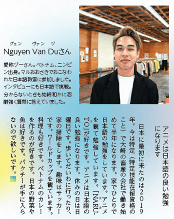 具体的には、「在住外国人実態調査」を実施し、町内に定住する外国人、国際的なルーツを持つ方々の中から、出身国、在留資格、職業などの多様性、住民生活への関わり方などを考慮した上で対象者を選び、合計10 回、18名にヒアリングと取材を行いました。そして、その成果を、2023年2月号の町の広報紙(多文化共生特集記事「世界に友達を」)に掲載し、町内の世帯に配布するとともに、コンビニ等にも配置したほか、デジタル PR 冊子「世界に友達を」(A4×17 ページ)を制作したといいます。また、町役場本庁舎の玄関ロビーで、多文化共生展示会「世界に友達を」を実施し、そのオープニングイベントには、ヒアリングの対象者や関係者を招待し,展示会場において交流会を実施しました。