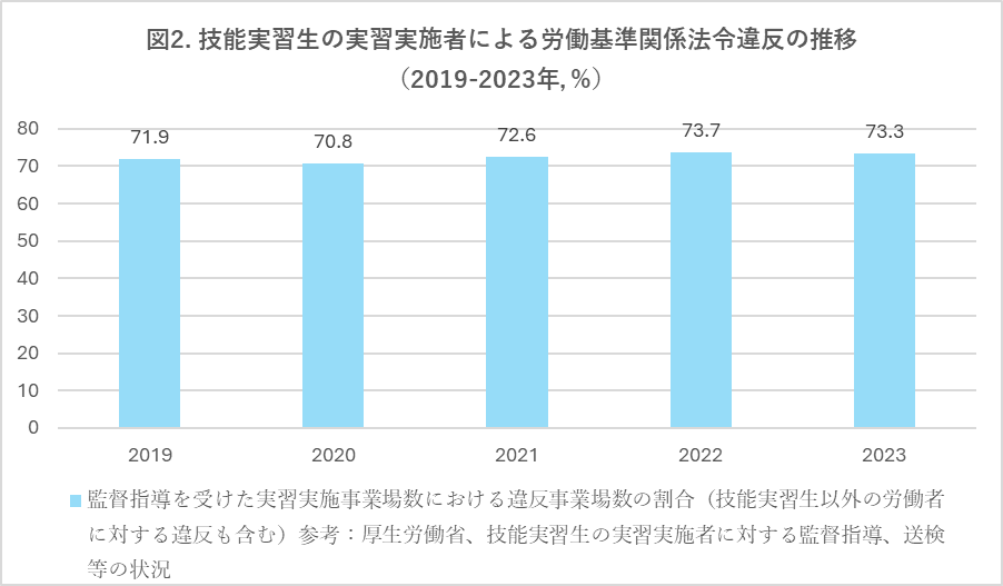 近年の日本では外国人雇用の増加が著しいですが、企業や組織による外国人労働者の受け入れには多くの課題が見受けられます。技能実習生の例を見ると、2023年に労働基準関係法令の違反が疑われ監督指導を受けた実習実施者は10,378事業場で、その73.3%に相当する7,602事業場で違反が認められました(図2)。同年の定期監督等の対象となった一般的な事業場での違反率は69.6%で、大差でないものの、技能実習生受け入れ事業所の違反率は上回っていることが見受けられます。こうした差は近年の傾向です。